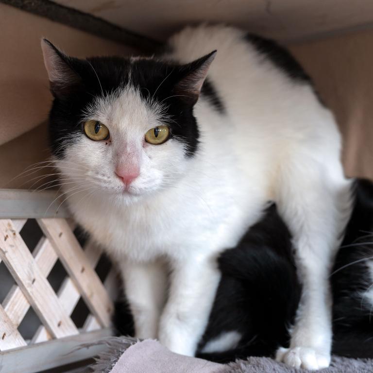 Emily, geboren 2023, zeigt sich anfangs etwas vorsichtig. Beim ersten Betreten des Zimmers wird man schon einmal freundlich angefaucht – aus Unsicherheit, nicht aus Aggression. Mit ein wenig Geduld lässt sie sich jedoch streicheln und entwickelt sich bestimmt schon nach kurzer Zeit zu einer kleinen Schmusekatze.