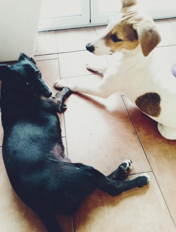 In ihrer Pflegestelle lebt Pearl friedlich mit anderen Hunden und Katzen zusammen. Draußen kommt es stark auf ihr Gegenüber an.