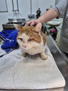 Hat ein verletztes Auge - wurde zum Tierarzt gebracht.