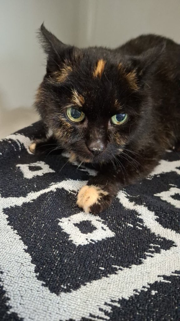 Katze weiblich, kein Chip, in Lagerhalle im schlechten Zustand gefunden, war bei Tierarzt-jetzt im Tierheim
