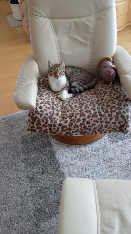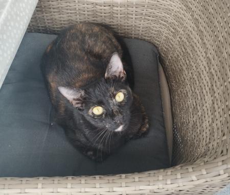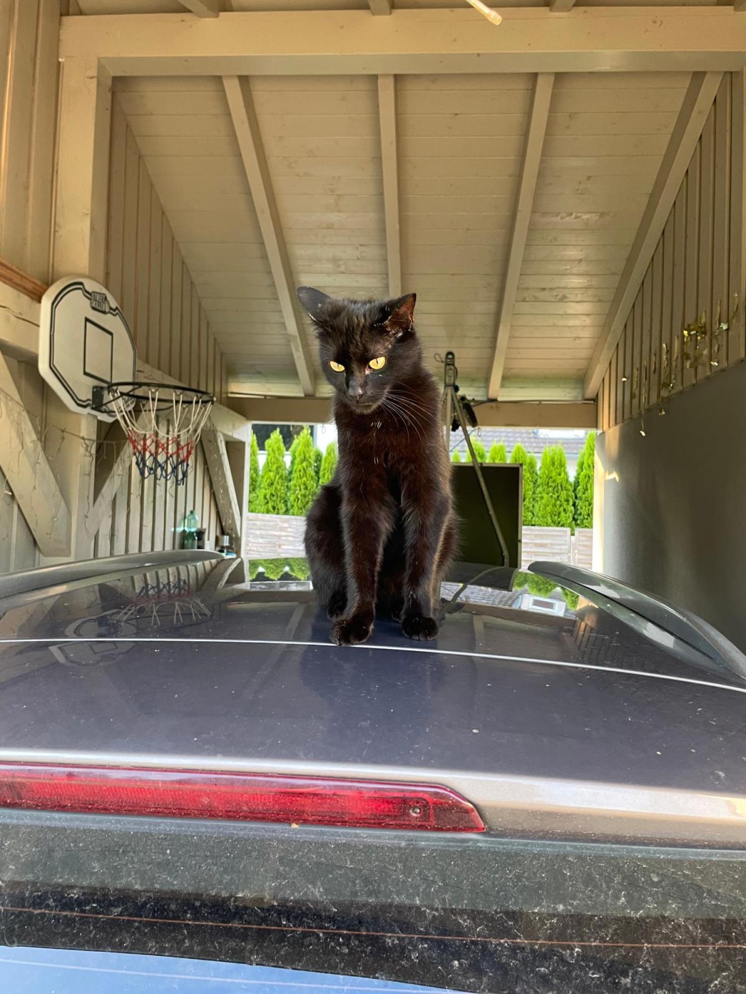 Unsere Katze ist 2018 geboren. Sie hört auf den Namen Mausi. Sie ist sehr sanft (miaut sehr leise). Sie ist schreckhaft, dennoch sehr verschmust. Sie hat gelbe Augen und ihr Fell ist Schilldpatt (Schwarz mit braunen Flecken). Sie ist gechipt, hat aber keine Tattoos.
