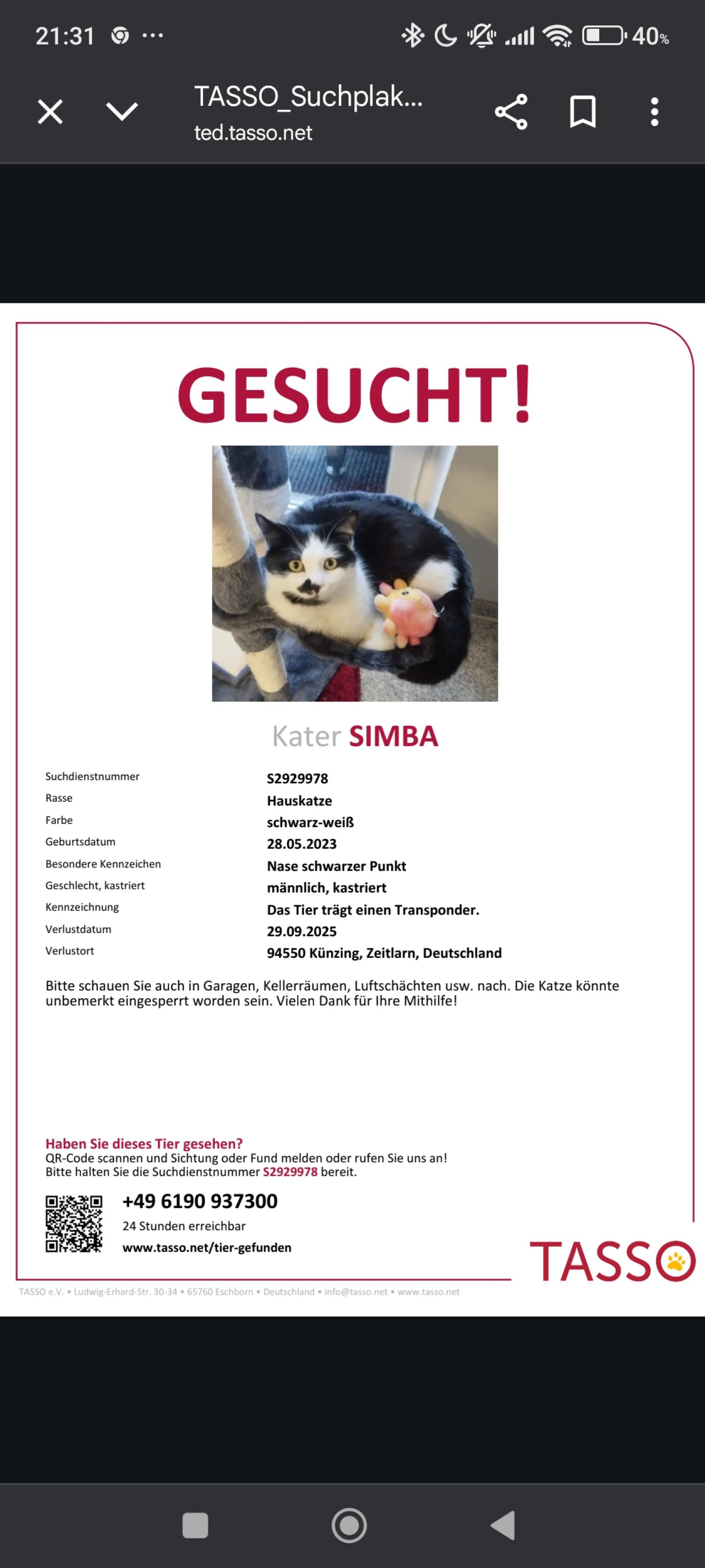 Hier können Sie uns Ihr vermisstes Tier melden: