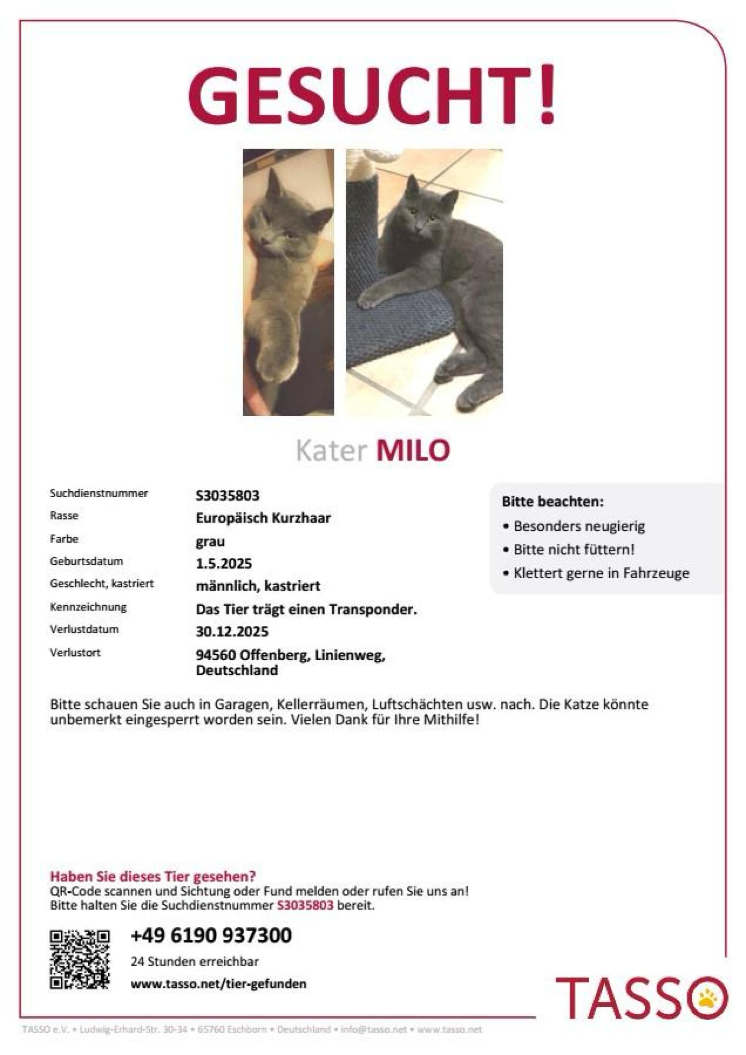 Milo ist ein 8 Monate alter kastrierter Kater. Er hat ein sehr schönes graues, kurzes Fell, ist sehr neugierig und flink (deshalb könnte er auch schnell in ein offenes Auto, oder eine offene Wohnungstür flitzen). Registriert bei Tasso.