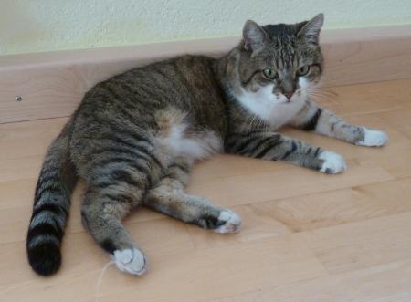 Freddi ist am Kopf, Rücken, Schwanz graugetigert (stellenweise leicht bräunliche Einfärbungen). Auf der Unterseite (Bauch, Hals) und den Pfoten ist er weiß. Freddi ist knapp 1,5 Jahre alt und ein eher kleiner, zierlicher, schlanker Kater. Telefonnr. 09935-1373