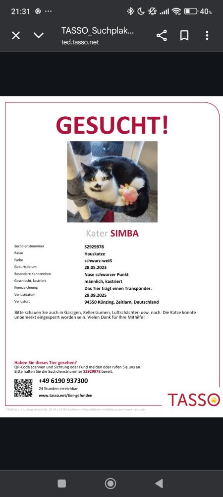 vermisst seit 29.09.2025 in 94550Besondere Kennzeichen: Schwarzen Fleck auf der Nase