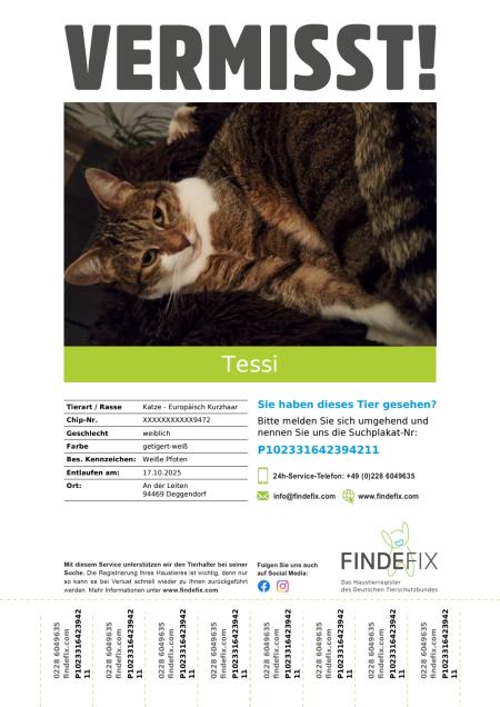 vermisst seit 12.09.25 in 94405 PolderingBesondere Kennzeichen: Rechtes Hinterbein fehlt