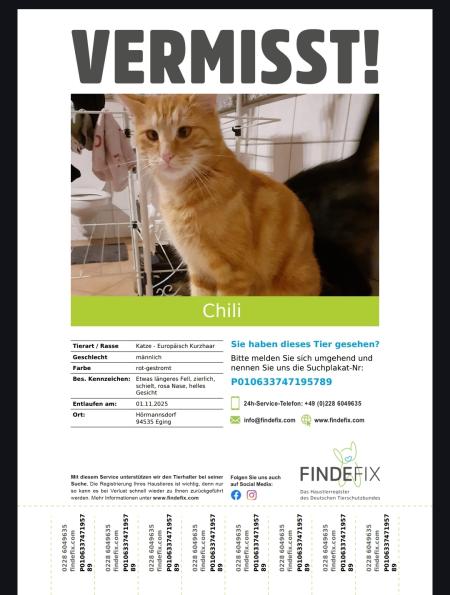 vermisst seit 22.09.2025 in 94569 StephansposchingBesondere Kennzeichen: kastriert, gechippt, reagiert auf pfeifen, große Nase