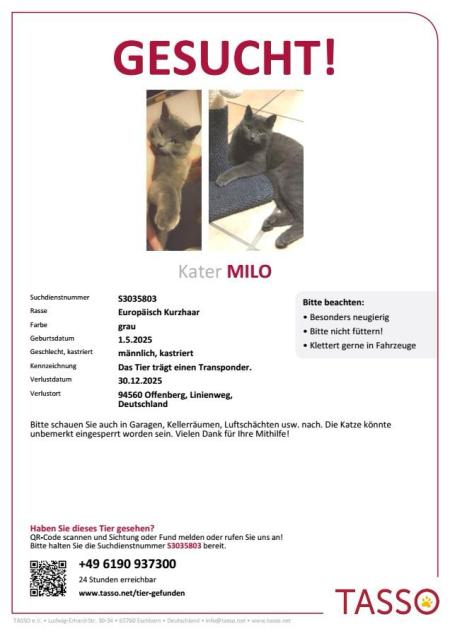 vermisst seit 2.1.2026 in 94428 KröhstorfBesondere Kennzeichen: Er ist grau-schwarz getigert, ist aber unterhalb des Kinn weiß. Er ist 1,5 Jahre alt und kastriert.